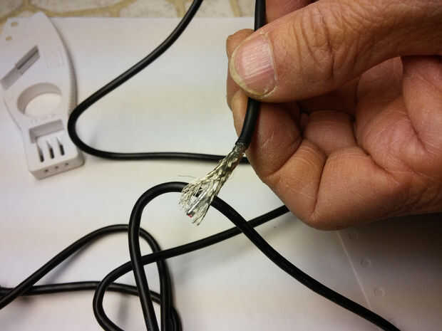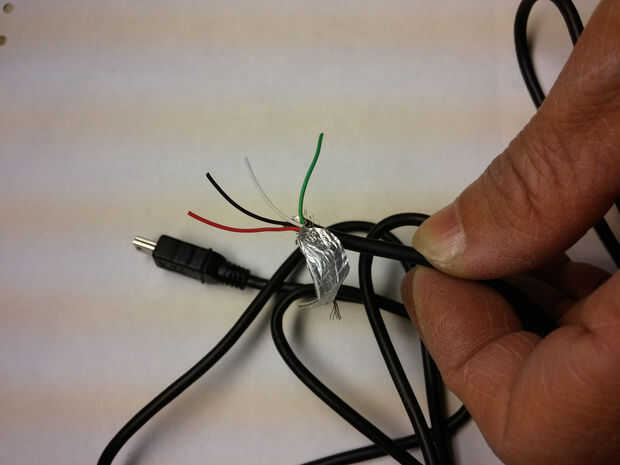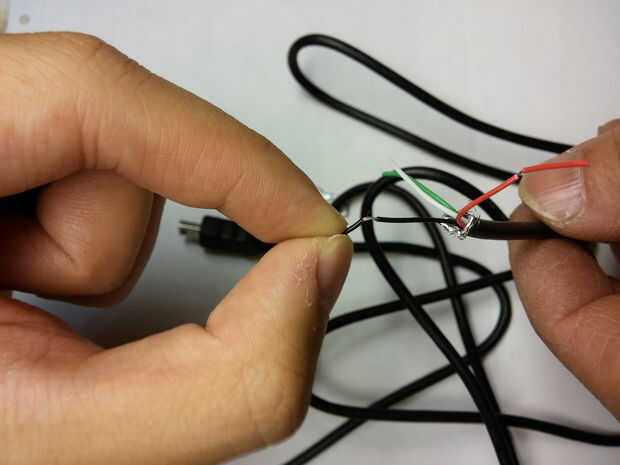Comience por cortar con tijeras el extremo USB del cable (Figura 1). Utilice una cuchilla afilada para tira de aproximadamente 2" de la cubierta exterior del cable, exponer el cableado Protecto por debajo. Puede descartar este protector cableado y el papel de aluminio que rodea los 4 cables más pequeños. Con un pelacables, con cuidado haga una incisión de 1/2" en el cable rojo y eliminar manualmente el casquillo rojo. IMPORTANTE: Gire la manga mientras que quita para asegurar que no se deshilache ocurre (cuadro 5). Repita el proceso para el cable negro. No necesita los cables verdes o blancos para este proyecto.