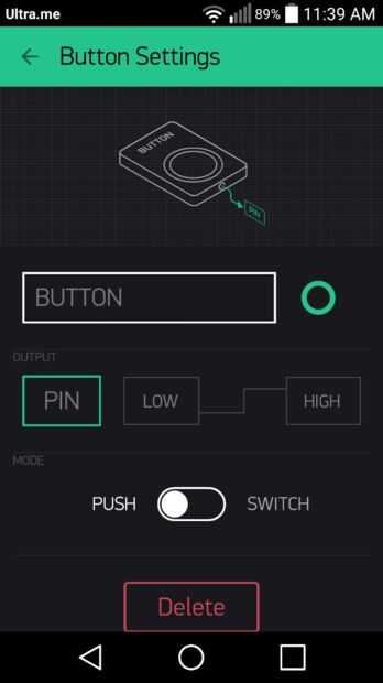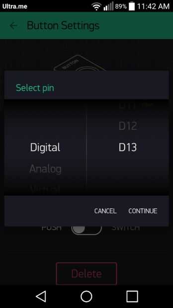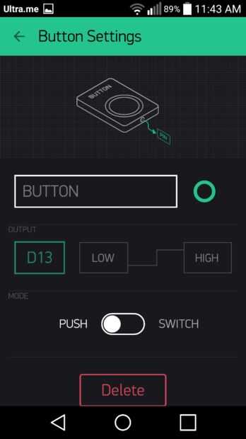 En esta pantalla (Foto 3), puede cambiar el nombre de tu botón, cambiar su color, selecciona los pines de Arduino que el botón de control y establecer modo del botón de. Nos interesa sólo el pin y el modo. Pulse sobre "PIN" y elegir "D13 Digital" y asegúrese de que el modo está ajustado a "PUSH" (foto 4 y 5). Cuando haya terminado, pulse el botón back. Eres todo terminado de definir Blynk! Pasemos a la parte de Arduino.