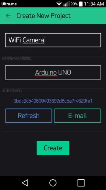 Ahora, tenemos que configurar la comunicación entre nuestro smartphone y nuestro Arduino. Ya que va a utilizar un teléfono con Android, he descargado la aplicación Blynk desde el Google Play Store. Lanzar la aplicación y crear una cuenta. Una vez que has creado una cuenta, inicie sesión en la aplicación de Blynk, y usted debería ver una pantalla dice "Crear proyecto nuevo" (cuadro 1). Pulse en el nombre de su proyecto, y asegúrese de que "Arduino UNO" es elegido como el modelo de hardware. Usted también notará un "Auth Token" con una larga cadena de letras y números. Esto por correo electrónico a ti mismo, necesitaremos más tarde para sincronizar nuestra aplicación Arduino y Blynk juntos. Cuando haya terminado, pulse "crear" (Foto 2).