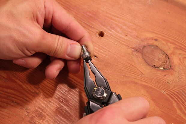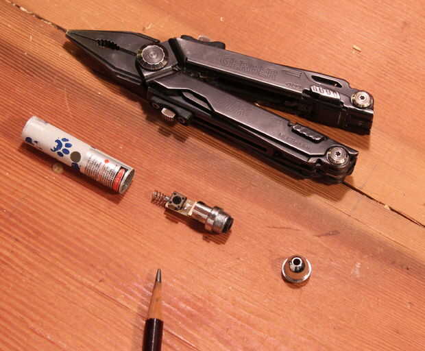 Para conseguir el objetivo desde el inicio de puntero láser desenroscando el cono frontal y la cubierta posterior del tubo. Retire las pilas. Con el extremo de la goma de borrar de un lápiz, empuje las vísceras fuera de la parte delantera del tubo. El frente de este montaje (el lado sin la primavera en contacto con las baterías) es donde se encuentra la lente de enfoque. Desenrosque la pequeña pieza negra de plástico delante de la lente y la lente vendrá gratis.