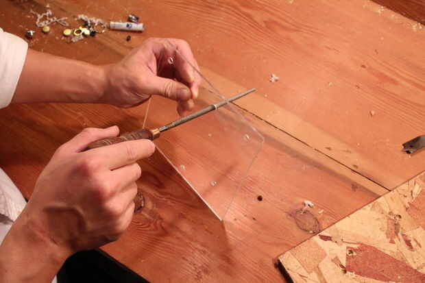Si la lente no cabe bastante, de archivo o use papel de lija para agrandar el agujero. Asegúrese de hacerlo lentamente y probar el ajuste a menudo. Es fácil de adelantar y hacer el agujero demasiado grande!