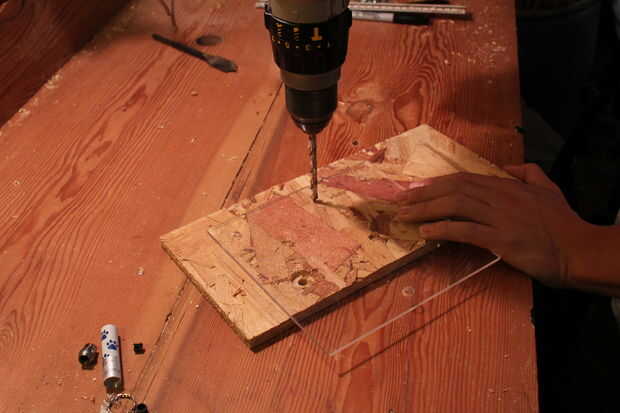 ¾" de la parte delantera de la etapa de la cámara (en línea con los agujeros de perno) taladre un agujero para el lente.