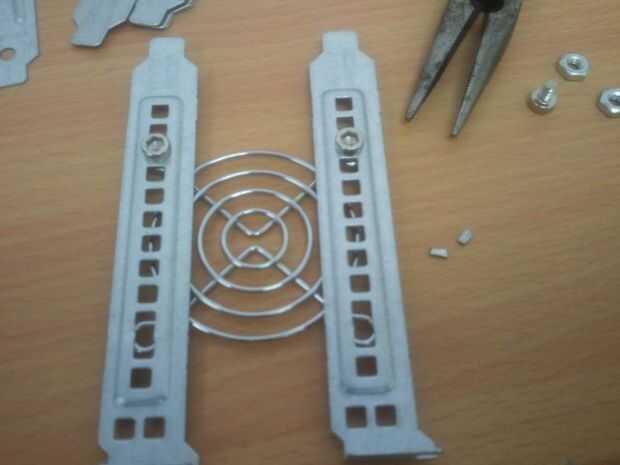 Las monturas de dos parte inferior de la rejilla del ventilador no colocan a sólo Deslice los pernos a través, así que tomó un par de alicates de punta delgada y había torcida sólo esa pestaña hacia fuera. Inserte los dos pernos, todo cuadrado para arriba, y la estructura principal se realiza.