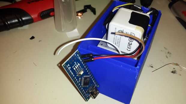 Utilizamos un cargador USB de toma por un motivo concreto: cargadores USB están en todas partes y que regulan la cantidad perfecta de voltaje para alimentar el Arduino. El Arduino acepta un voltaje de entrada de 5v del USB, así que para alimentar el Arduino para este proyecto, aprovechamos en el conector USB del cargador. Por supuesto, eres definitivamente Bienvenido a utilizar su propio 120v AC al circuito reductor de 5v DC.