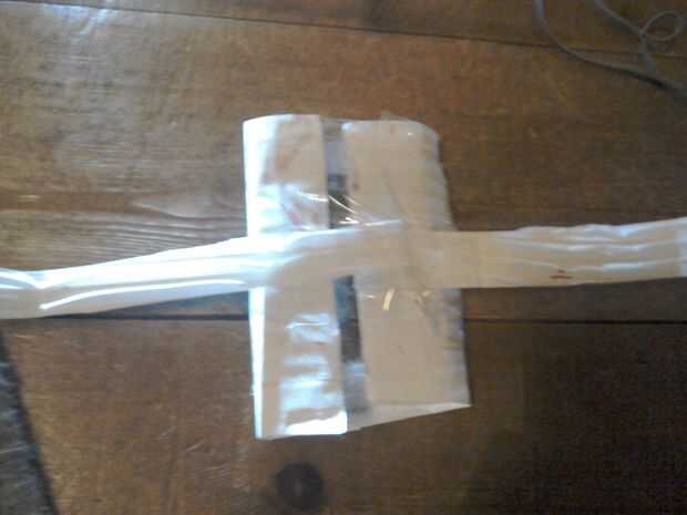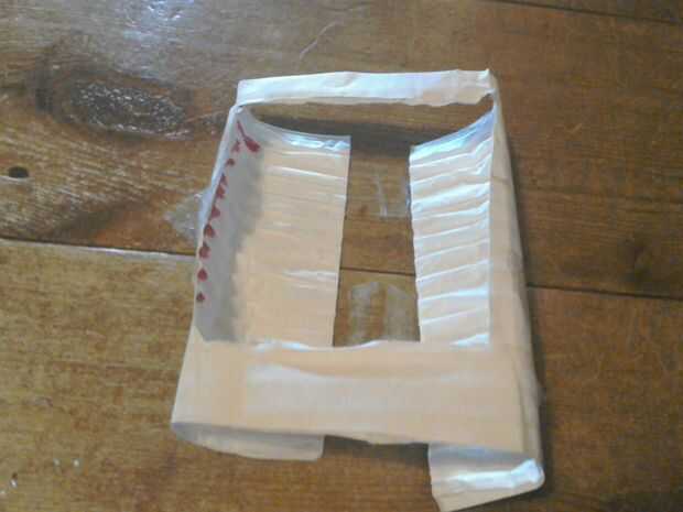Cortar dos tiras largas de cartulina restante y asegúrelas con cinta adhesiva. Luego corte una abertura en la pieza más ancha de cartón. Finalmente la cinta el mango en el soporte.