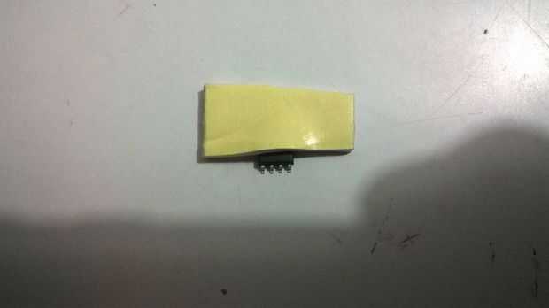 Ahora, tomar el IC SMD. Colóquelo sobre una superficie plana y pegar una cinta de doble cara para que IC es fija y no se mueva mientras se suelda. (Ver la foto)