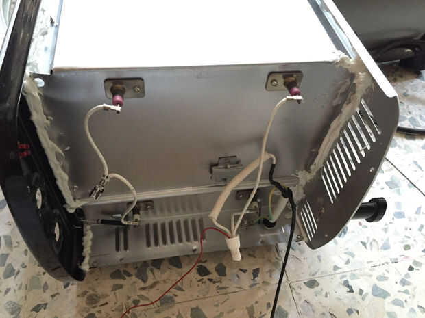 Abrir el horno y verás el cableado. Una nota rápida sobre los elementos calefactores cableado: generalmente tampoco tendrás dos elementos o dos pares de elementos. Tenía dos pares de ellos con un par para la parte superior y otro para la parte inferior. Cada par se conecta en serie. Esto quiere decir que están clasificadas para medio su AC de alimentación de voltaje. Ya que estoy usando 220V AC, esto significó que cada elemento está clasificado para 110V AC. Había comprobado la manera dura. Al principio conecté todos los cuatro calentadores individualmente pero calienta muy rápido (como en segundos).