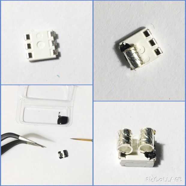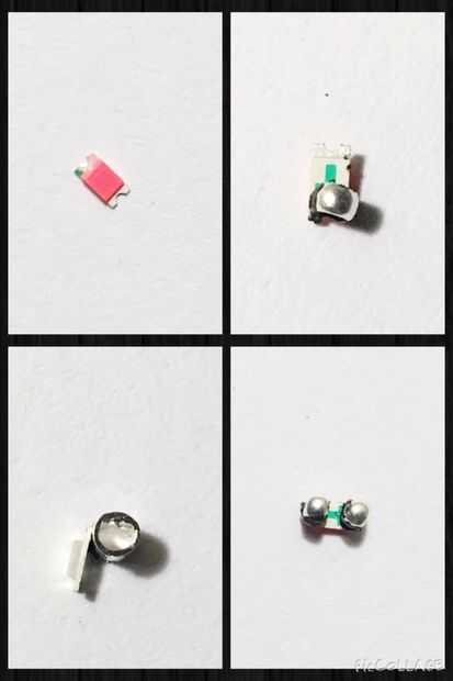 SMDs pueden ser muy pequeños, como el grano de arroz pequeño, que puede hacer difícil trabajar con. Tengo unos cepillos muy finos que compré específicamente para uso con pintura conductora desnuda. La pintura comienza a secar rápido y es conductor después de 15 minutos. La pintura también actúa como un pegamento. Básicamente, frío puede soldar un material conductor (en nuestro caso, latón o plata que prensan granos) a cada lado del SMD para darle más espacio para trabajar con y para que pueda coser el SMD a la tela.