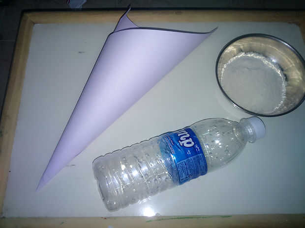• Doblar y hacer una forma de embudo con la hoja A4. Esto se utilizará para llenar la harina dentro de los globos.