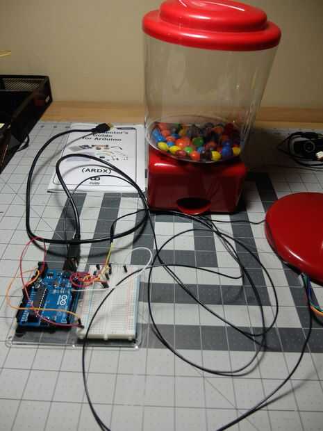 6. Una vez que la máquina de dulces es volver juntos, conectar los dos cables de motor hacia el circuito de arduino.