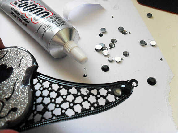 He añadido unos Strass negros y plata en las esquinas cerca de los anillos de salto. Son bastante sutiles, pero creo que trae un poquito de interés y equilibrio visual a una pieza pesada otro tipo de centro.
