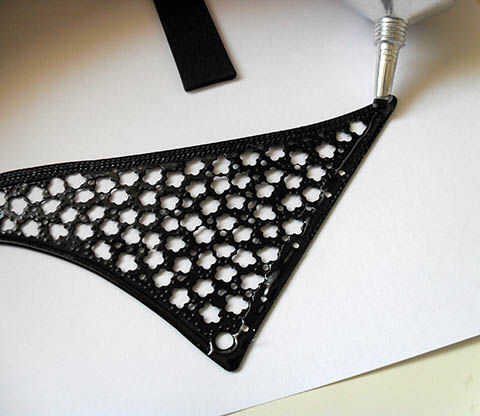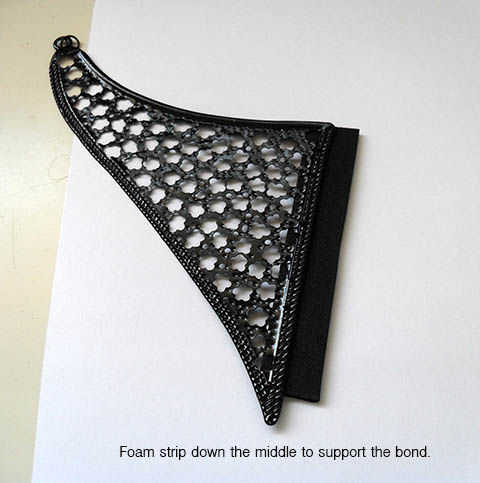 Para unificar los 2 pendientes en una placa, usé una tira de espuma negra para apoyar la adherencia del adhesivo. Un bono de la espuma nuevo aquí es que debe ayudar a mantener el Gorjal estable en mi piel durante desgaste.