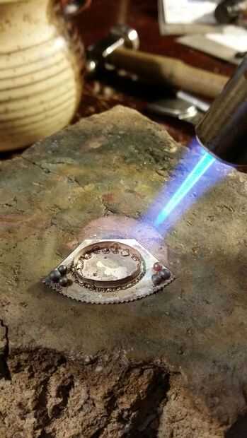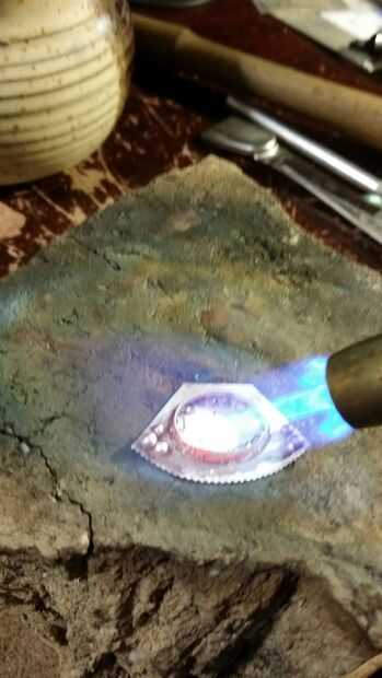 sí! tiempo de fuego otra vez!! usted quiere lentamente y uniformemente el calor la pieza de entier hasta el flujo se cristaliza. al igual que con el bisel usted wan para calentar lentamente para que flash no hervir el flujo. poniendo sus fichas de nuevo en su lugar, cuando el trabajo es una mierda caliente! Confía en mí.