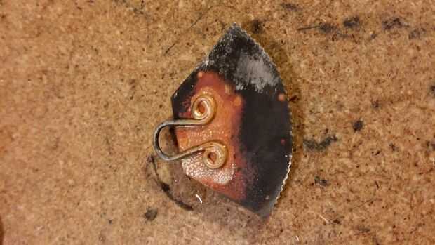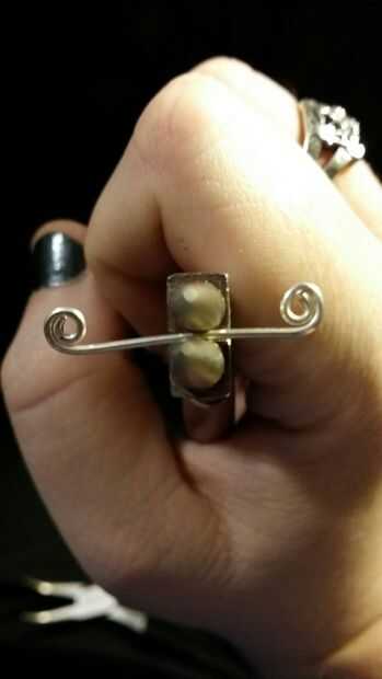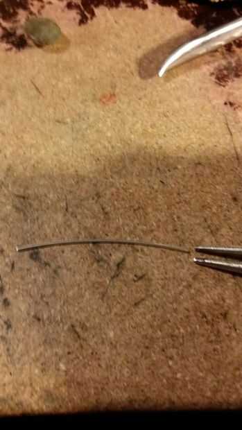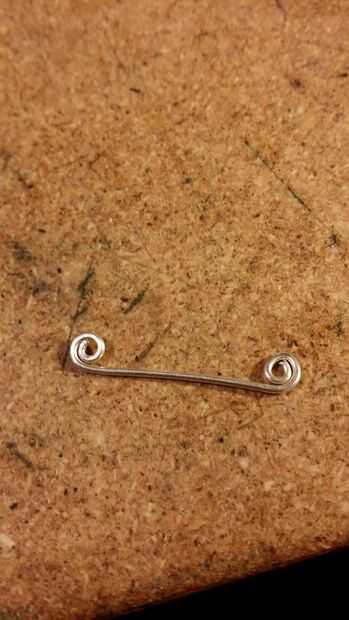 sus plyers de nariz redonda y espirales en cada extremo hasta que loks como esta. Agáchate en el centro. Figura hacia fuera donde usted quiere colocar en la parte posterior de la pieza. Siga las instrucciones de soldaduras para hacer el bisel y los gránulos para fijar el alambre del achique. cuando, una vez en el recipiente de la salmuera.