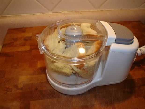 Para hacer el pan miga Coloque 2-3 rebanadas de pan en un procesador de alimentos y mezcla hasta que queden migas.
