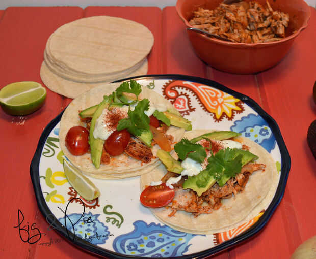 6. una vez que el pollo ha cocido desmenuzar en trozos de tamaño. Calentar los tacos hasta que estén suaves, sacar un pollo en cada taco y añadir las verduras y colocar una cucharada del queso de queso de cabra en la parte superior.