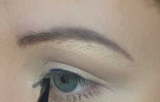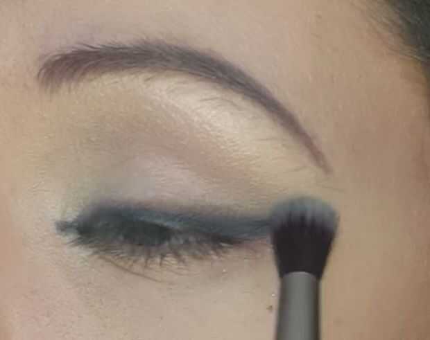 Luego toma una sombra de ojos negra acabo de aplicar esto a la línea de pestañas y crear un ala. La razón por la que estoy usando sombra es de modo que pueda mezclar este fuera más fácil y se da el efecto smokey que busco. Luego ir con ese color amarillento y aplicamos sobre la línea que solo creado para añadir una poco de calidez a la mirada. Entonces tomo una brocha esponjosa y sólo mezclar esto muy suavemente hasta que me siento feliz.