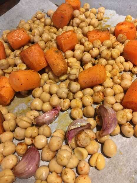 Después de 40 minutos, coloca tus garbanzos drenados en la bandeja con las zanahorias.