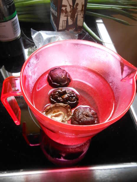Preparando el shitake es muy fácil. Sólo hervir una tetera, colocar 4 setas shitake en una taza de medir y llenar con agua hirviendo a 500ml. Ésos setas déjelo por unos 30 minutos. Ver TV o preparar sus ingredientes.