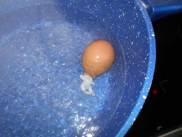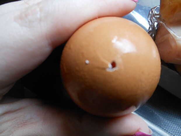Apuñala un agujero en la mía, sólo una muy muy pequeña en un extremo. Que hace más fácil de pelar cuando su hecho. Por lo tanto su no malabarismo un huevo caliente despegando pedazos pequeños o volviendo loco. Su normal para una pequeña cantidad de huevo a exudar hacia fuera durante su cocción.
