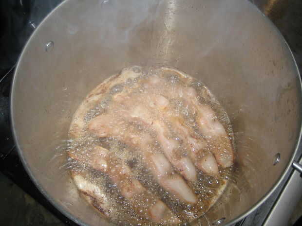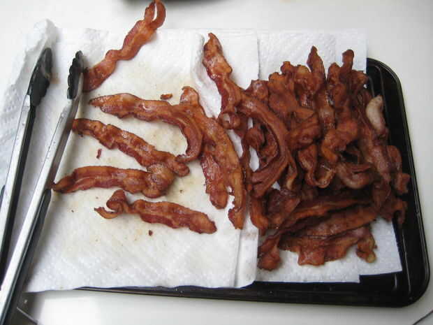 En una sartén antiadherente, freír el tocino en tandas hasta que estén ligeramente dorados y comienzo a crujientes. Con un par de tijeras corte en trozos de 1 pulgada.  Hice que mi cocina fuera en el quemador de mi barbacoa no llenar la casa completamente con olor a tocino.  La esposa era feliz.