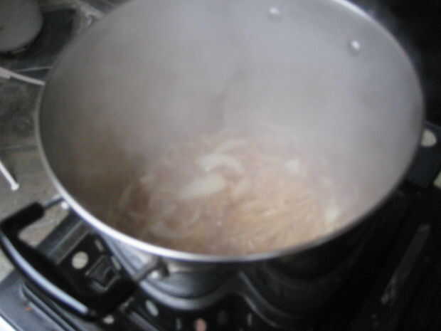Freír la cebolla y el ajo en la grasa de tocino prestados a fuego medio hasta que estén transparentes.