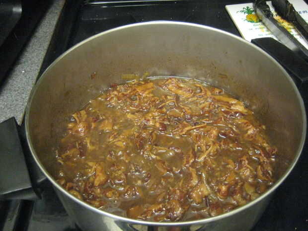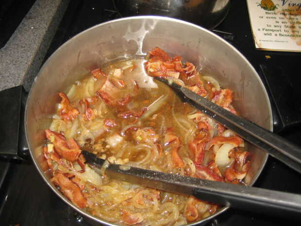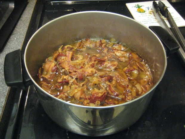 Cortar el tocino en trozos de 1 pulgada antes de poner el tocino, la cebolla y el ajo en una olla de base pesado del arrabio.  Agregar el resto de los ingredientes excepto el agua.  Cocinar a fuego lento durante 4,5 horas.  Añadir 1/4 de una taza de agua cada 25-30 minutos si el líquido se reduce demasiado rápido.  Agitar el bote en este momento demasiado si usted no necesita añadir agua.