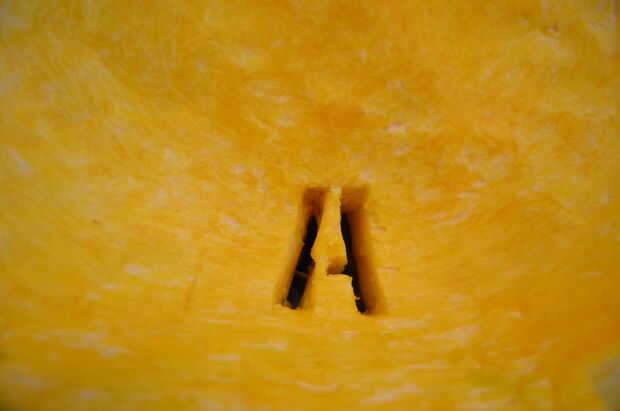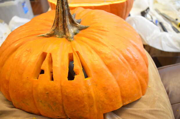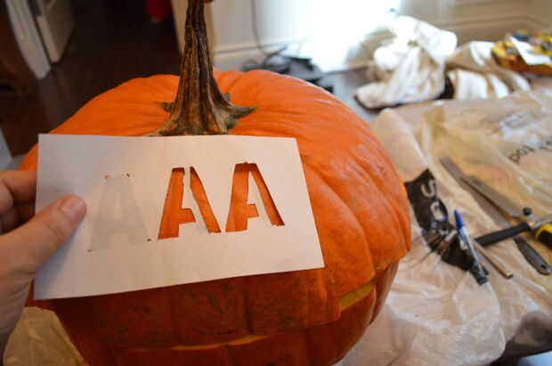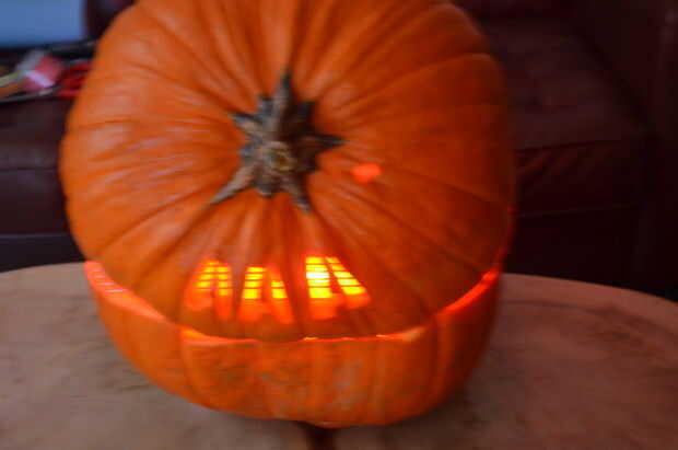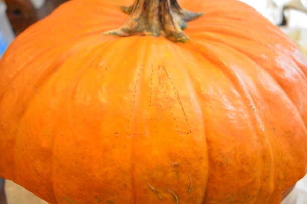 La parte más difícil de esta compilación realmente fue tallado el nombre de barras en la tapa de la calabaza. Tengo la suerte de que era solamente 3 cartas! Imprimí un documento de plantilla y con un cuchillo la trazada en la piel de la calabaza. Tuve que colocarlo cerca del tronco de la calabaza donde la piel es realmente la más gruesa y también la menos suave. Mi cuchillo del exacto no fue tiempo suficiente para recorrer todo el camino y el tamaño de las letras fue limitado por la potencia y la "bisagra" por lo que fue un trabajo muy delicado con un cuchillo para asegurarse de que las letras eran legibles de ambos lados de la calabaza.