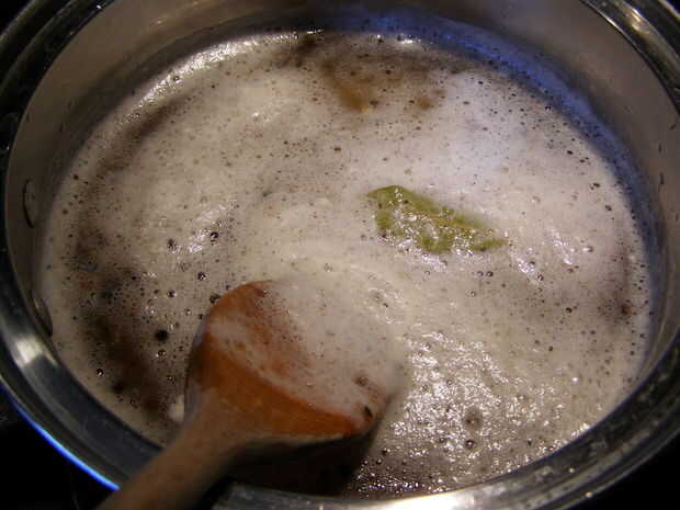 Ahora, sobre este negocio "bien hecho". Apicus parece decirnos simplemente tirarlo todo, agregar el resto del vino y luego filtrar la mezcla. No parece correcto que me agregue todo esto y entonces inmediatamente filtran hacia fuera en el siguiente paso, así que añadí un poco de aquí un paso. Re calienta la mezcla de miel y vino, ahora con especias, sólo hasta el punto de ebullición antes de agregar el resto del vino, y déjalo reposar una hora aproximadamente mientras yo iba haciendo otras cosas.