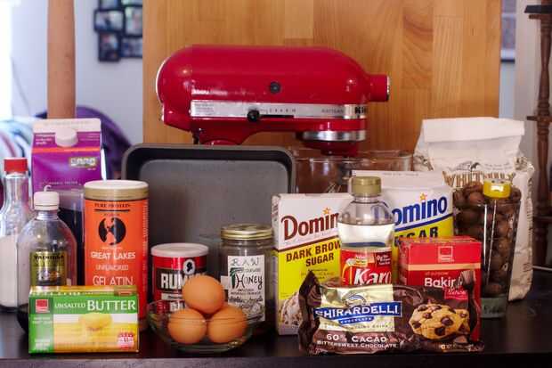 Para los brownies, requerimos: azúcar, harina, mantequilla, chispas de chocolate, huevos, sal, levadura y extracto de vainilla. También necesitarás una mesa de mezclas, algunas láminas y una cacerola para cocinar tus brownies en.