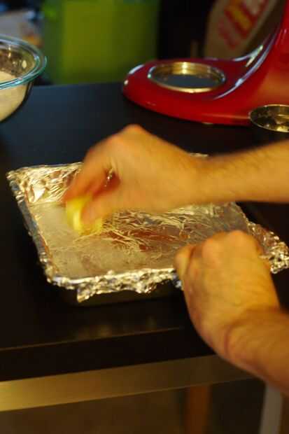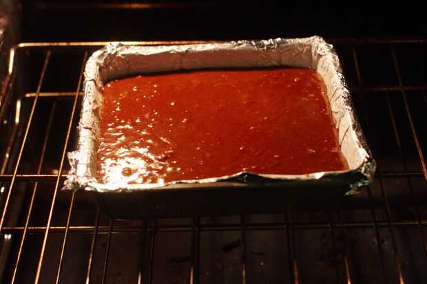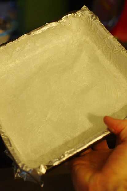 Preparar una bandeja para recibir tus brownies (utilicé un molde cuadrado de 8 x 8, que era un poco pequeña en el lado pequeño). Es la forma más efectiva de preparar la bandeja cubrir el interior hoja \with, frotar la mantequilla por toda la hoja, luego cubra la capa de mantequilla con la harina. Esto garantizará una sartén limpia y una liberación sin problemas.