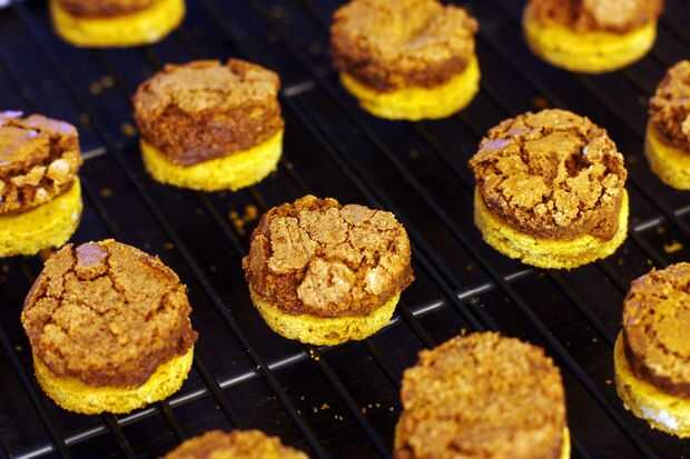 Una vez que los brownies estén frías, elevarlos hacia fuera por su envoltura de papel de aluminio. Perfore segmentos ronda con su cortador de galletas y luego corte los segmentos a la mitad. Pila de los segmentos de brownie encima de las galletas.
