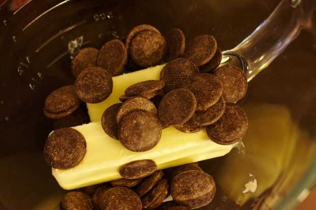 Coloque la mantequilla y los trocitos de chocolate juntos en un tazón y el calor se les funden. Puede hacerlo en un baño María en la estufa o en el microondas. Si usted decide usar un microondas, recuerda no calentar la mezcla durante más de 45 segundos en un tramo y revolver entre las calefacciones para evitar que queme el chocolate.