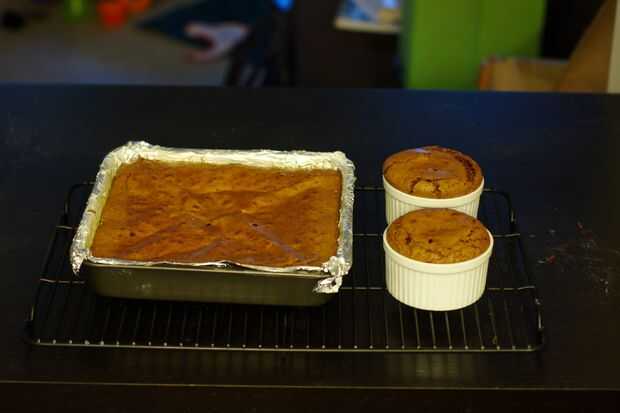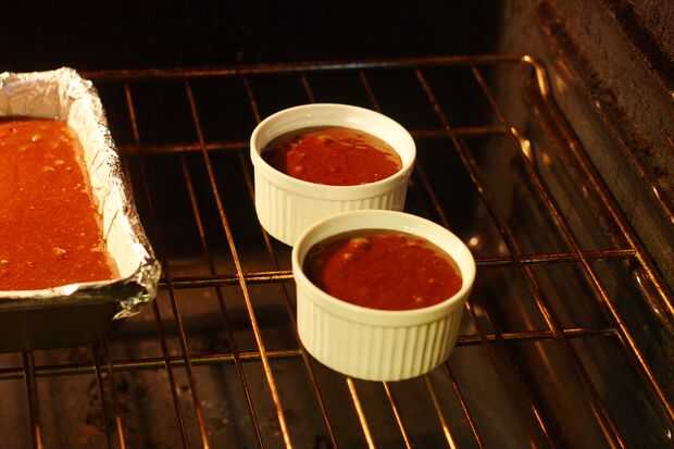 Vierta la mezcla en el pan! Esto hace que demasiada pasta para un molde de 8 x 8 pulgadas, así que también tuve algunos moldes para sostener el exceso.