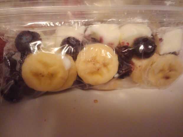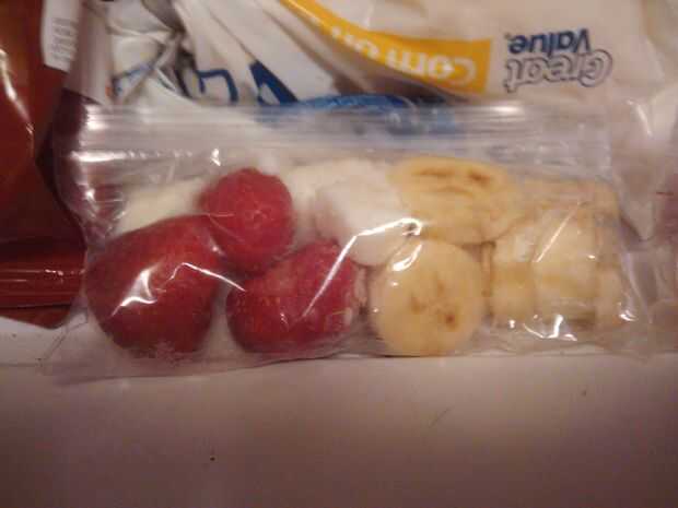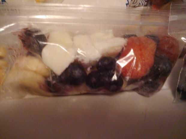 Pesar un cubo de yogur "promedio" y pesan hacia fuera. mina son aproximadamente 1 oz. cada uno. Tome la cantidad de cubos que se necesita para hacer un oz y cortarlas pedazos del mismo tamaño de las fresas para facilitar en la licuadora y colocar en la bolsa.