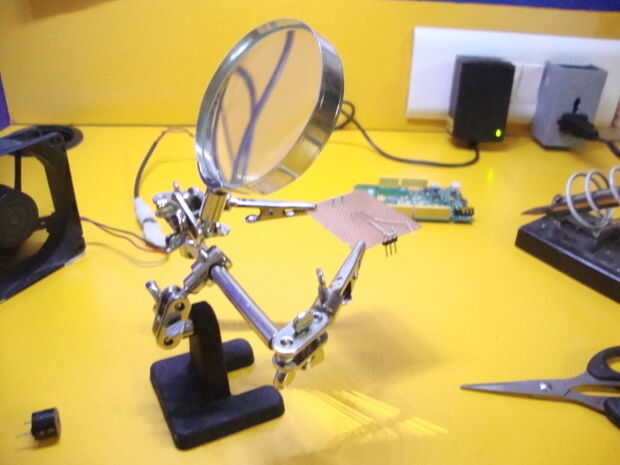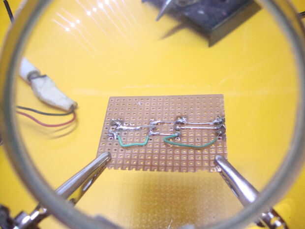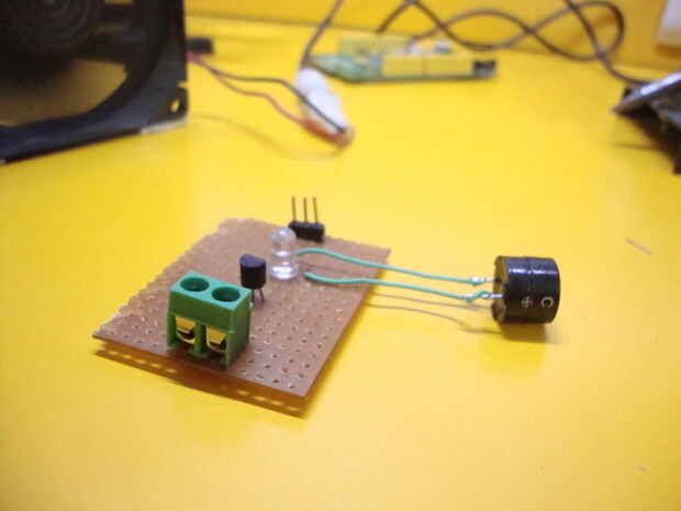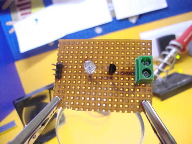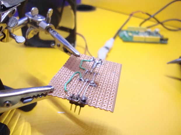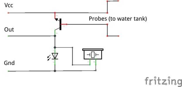 En un pequeño trocito de perboard soldar todos los componentes según el esquema dado anteriormente. Dos cables irá hacia el tanque de agua y un terminal de tornillo debe soldarse para conectarlos.