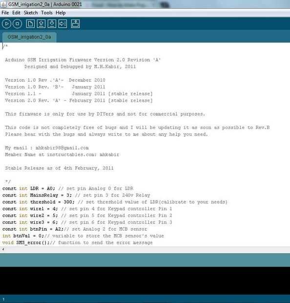 El código es below(GSM_irrigation2_0a.pde) adjunta y no voy a los detalles de subir un bosquejo para el Arduino ya que hay muchos tutoriales en la red a hacer lo mismo.