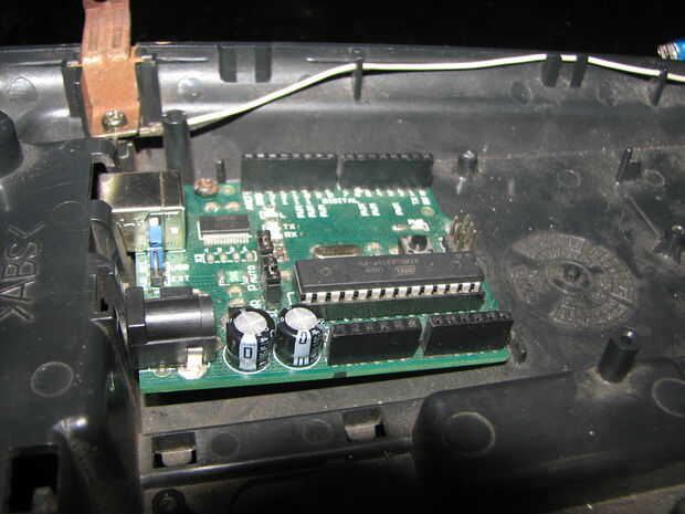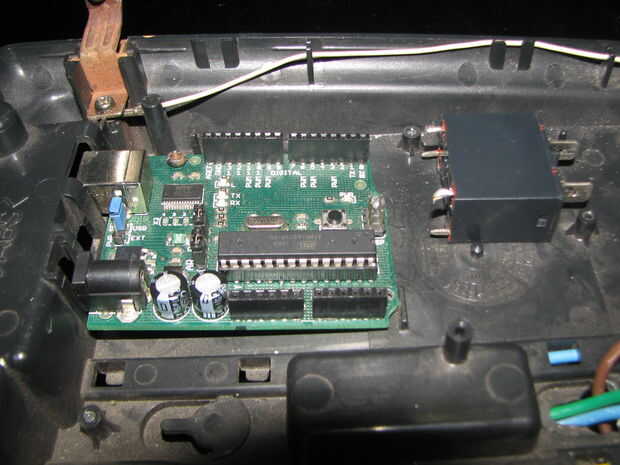 Me las arreglé para encontrar un teléfono inalámbrico muy adecuado en el que la electrónica bien preparada. Tuve que mentir sobre, recogiendo polvo, cuando me enteré que el Arduino equipado bastante bien y algunos rincones que se dremelled fuera de la electrónica encaja perfectamente.