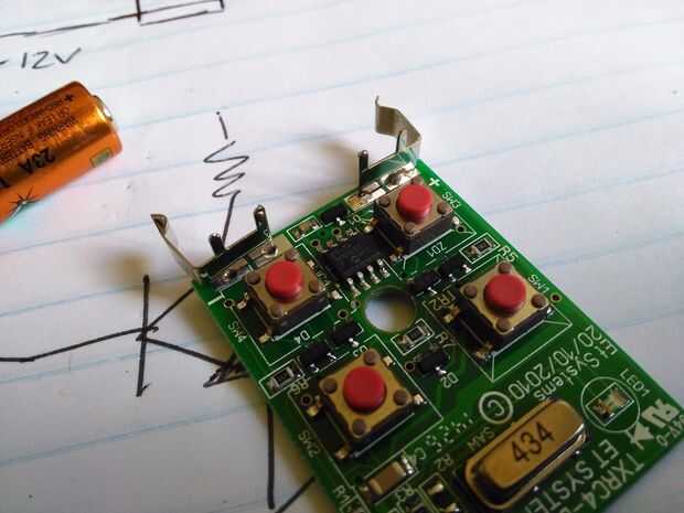 - Uno de estos extremos es probable ser conectado directamente a la batería (probablemente tierra, pero que podría ser cualquiera). Usted puede probar tomando la batería del mando a distancia y pruebas de continuidad entre los pines botones y terminales de soporte de la batería.