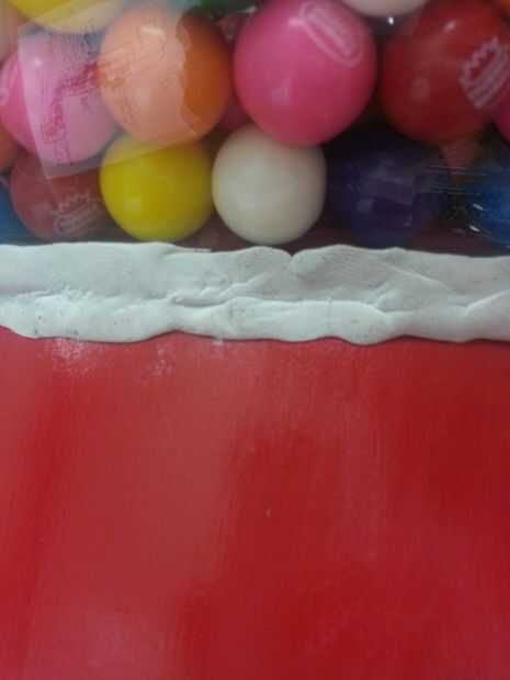 Tiempo de gumball! Llene el recipiente de vidrio hasta la mitad con chicles. Montaje de la parte inferior de la maceta a la abertura del recipiente de vidrio. Utilice la masilla para fijar el recipiente de vidrio a la maceta. ASEGÚRESE QUE EL TAZÓN DE FUENTE DE CRISTAL ESTÁ CONECTADO A LA MACETA PARA EVITAR QUE EL VIDRIO CAE ENCIMA!