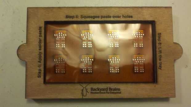 -Una parte esencial de la plantilla es la plantilla. Mi stencil fue cortada de Kapton(R) y enviada a nosotros por un servicio en línea. Aunque me imagino que usted podría hacer su propia plantilla utilizando un cortador láser en una hoja maciza de poliamida de 2-3 mil. Estoy investigando esto actualmente.