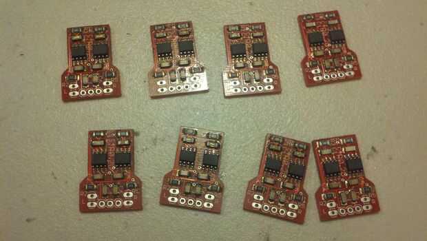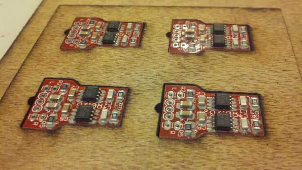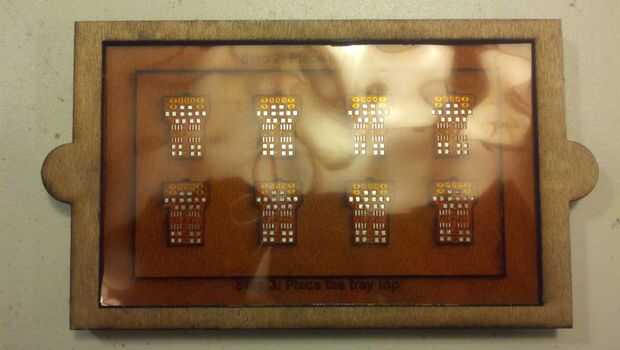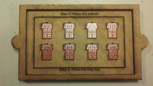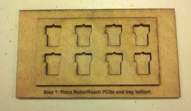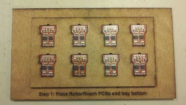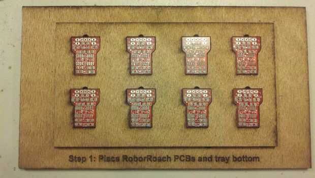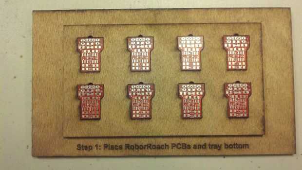 Paso 1: Colocar una cara arriba RoboRoach PCB en cada uno de los 8 agujeros y coloque la parte inferior de la bandeja.