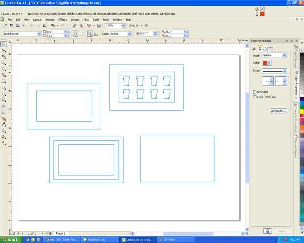 - En el primer conjunto de rectángulos (uno con los rastros de PCB), eliminar simplemente el tamaño de la plantilla rectángulo (un medio). Elegir un sistema para la base (no importa cuál) y eliminar ambos rectángulos interiores, dejando sólo el rectángulo base de tamaño. En el tercer set, eliminar simplemente el tamaño de la plantilla rectángulo (una media). Uno el cuarto, salir con los tres rectángulos concéntricos.
