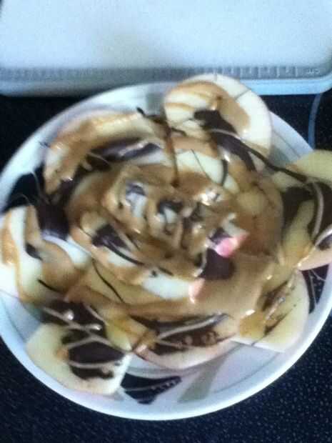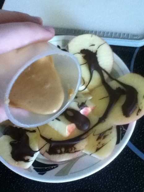 poner una cucharada grande en el envase y el microondas unos 15-20 segundos vierta sobre apple y viola! un fácil bocado delicioso si quieres también puedes espolvorear azúcar glas por encima