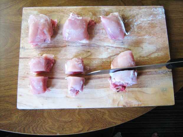 Encender la calefacción a 350 y picar los muslos de pollo por la mitad.