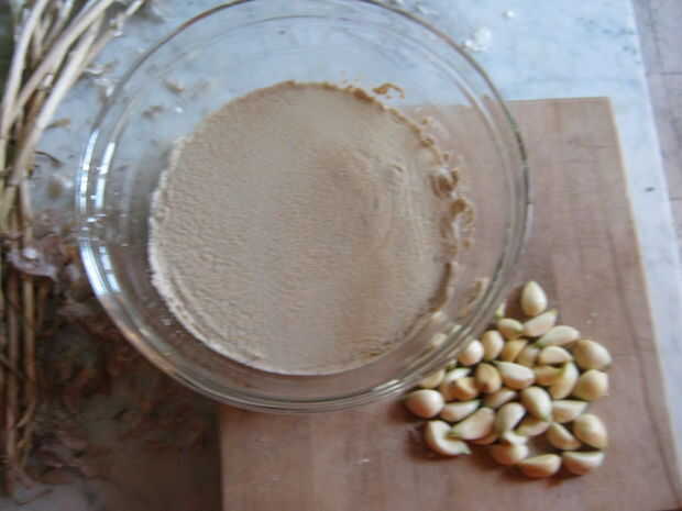 En un tazón pequeño mezclar el agua (tibia) y la levadura de pan.