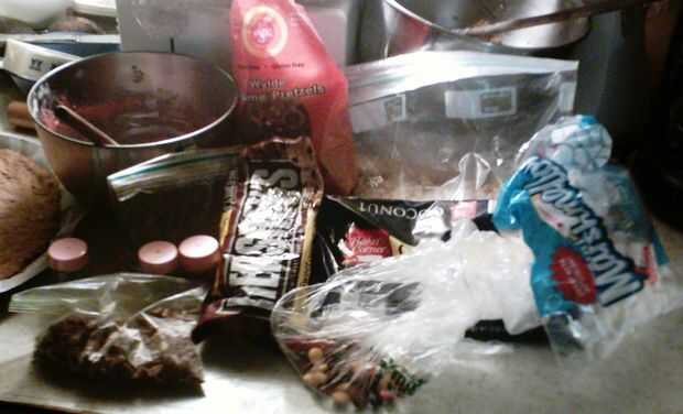 esta mezcla de snack es adictiva en serio! Con la combinación dulce y salada, no te equivocarás. Usted puede cambiar los ingredientes a usar lo que tengas a mano en casa (diferentes cereales, picados hasta dulces, rompen pretzels, dejan de lado los m