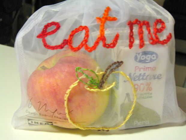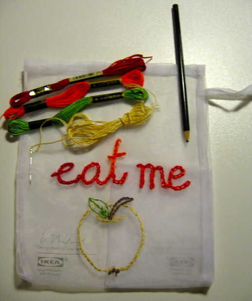 Todos los días, mi hija lleva a la escuela un snack de media mañana descanso. Sus maestros quieren hijos a comer sano, así que nos pidieron que les dan fruta. Ya necesitaba una pequeña bolsa para poner su merienda quería convencerla de comer fruta, bordado este bolso reciclado. Me inspiré por "Alice in Wonderland" para las palabras y los maestros de mi hija para el dibujo. Ser un principiante, opté por algo muy fácil. Dibujaba el diseño de la bolsa con un lápiz y luego selecciona los colores. Yo enseñé bordado usando videos de you-Tube (BTW. Gracias Wendi Gratz, eres grande!!!!!!). Usé dos puntos diferentes (creo que uno se llama puntada de cadena y la otra puntada de un tallo).