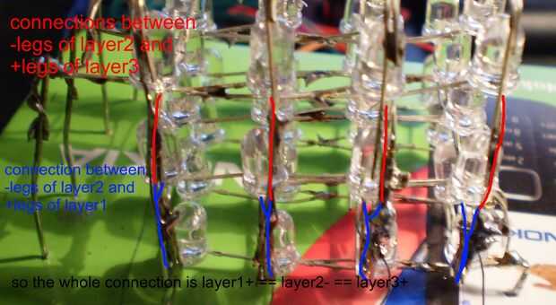 Para asegurarse de que vas a soldar correctamente esto todos juntos: los 4 exteriores - las patas deben quedar en el lado opuesto de la + piernas de la segunda capa (que debe soldarse abajo de la primera capa).