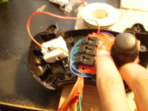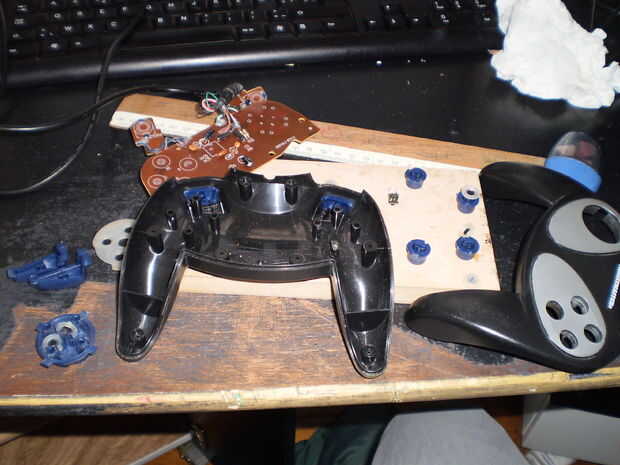 Primero abre mi controlador antiguo y quitar todos los componentes que estaban en su interior. No desecharlos ya que usted los necesite más tarde. He probado si encajaría en mi joystick y lo hizo! Quité algunos plástico porque de lo contrario el controlador no pudo cerrar con mi joystick en su interior. Esto será muy específico para cada caso de regulador y la palanca de mando así que no entraré en los detalles.